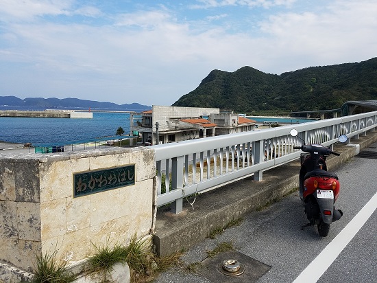 レンタルショップしょうさんから原付で5分もかからずやってきました、阿嘉大橋。