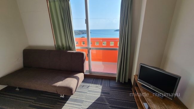 優しいお母さん、お孫さんにべったりのお父さんと息子さんお二人で経営されているホテル。粟国島の宿は和室のお部屋が主流なのですが、島内で唯一ベッドで眠れるお宿です。